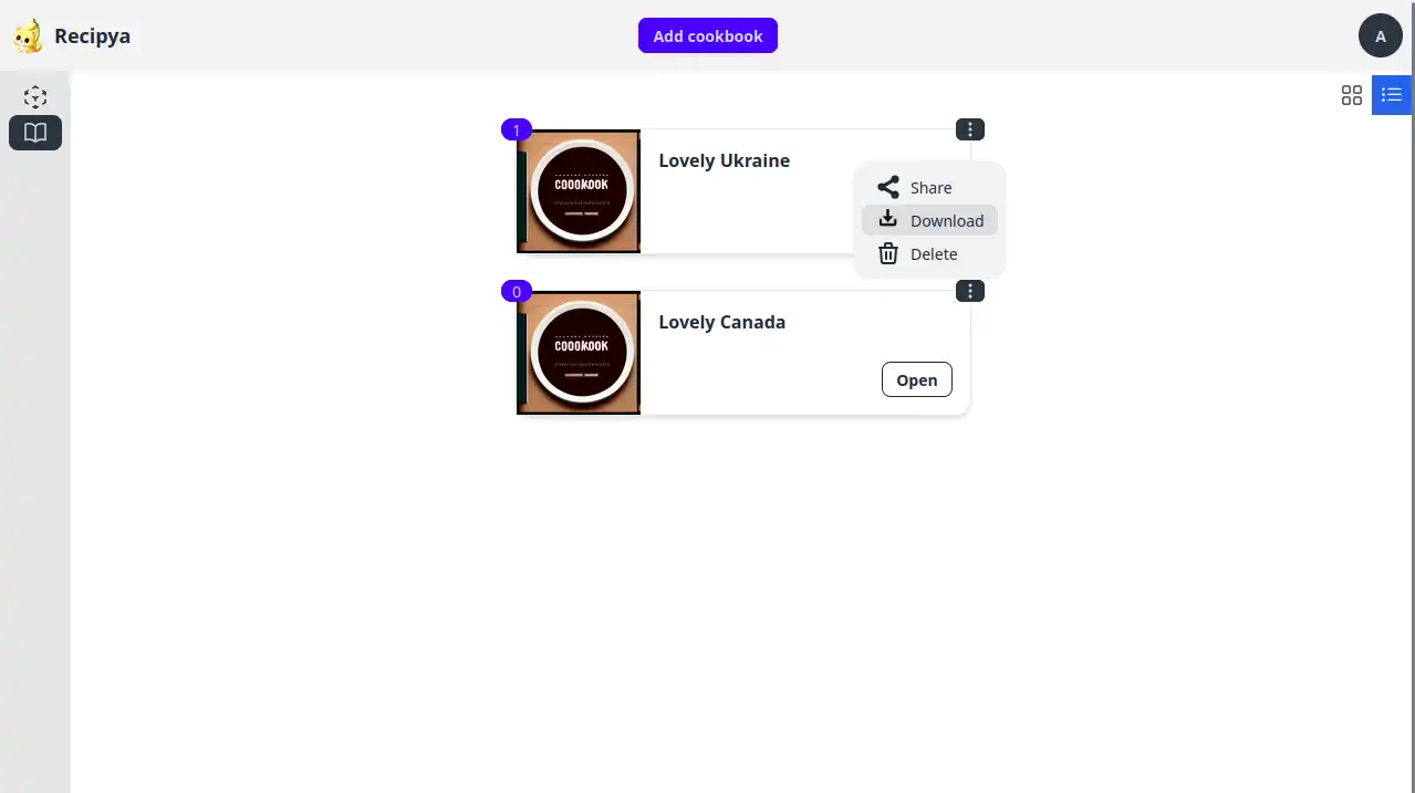 Pour télécharger un livre de cuisine, cliquez d’abord sur les trois points verticaux en haut à droite du livre de cuisine que vous souhaitez télécharger. Cliquez ensuite sur l’élément de sous-menu Télécharger. Le fichier sera téléchargé immédiatement.