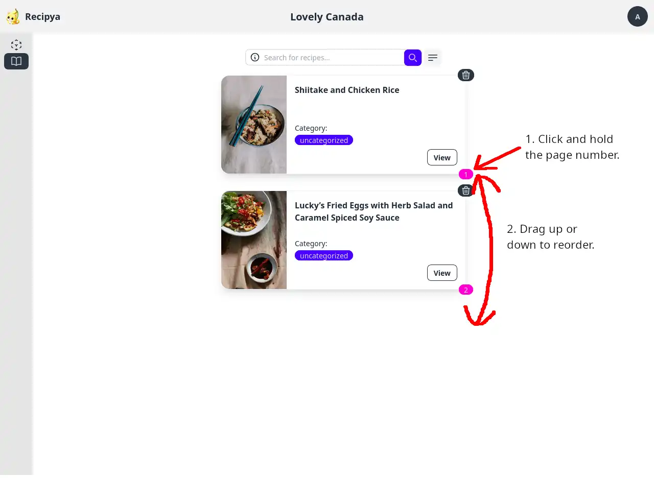 Pour les réorganiser, ouvrez d’abord un livre de cuisine. Dans l’image suivante, nous voulons échanger la position de la première recette avec celle de la dernière.
