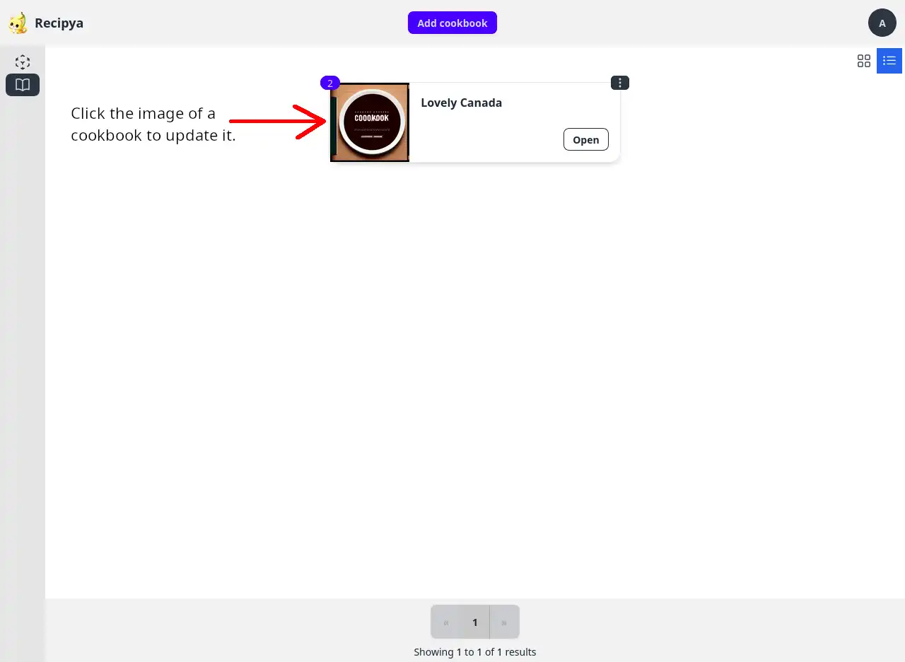 Cliquez sur l’image d’un livre de recettes pour la mettre à jour. Vous serez alors invité à utiliser le sélecteur de fichiers du système d’exploitation pour sélectionner une image.
