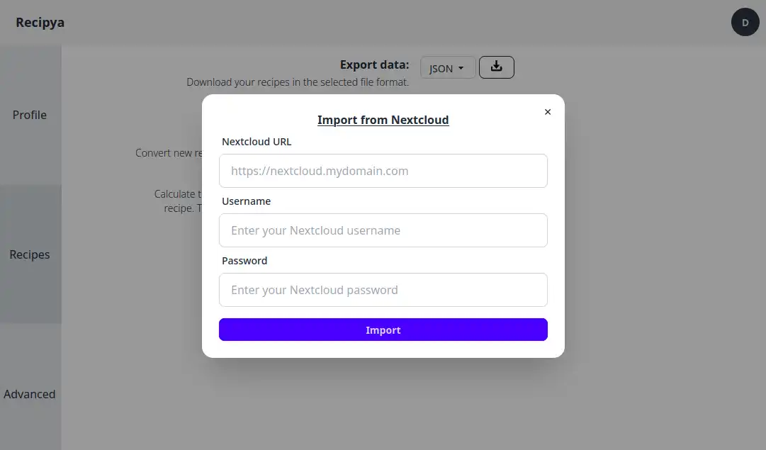 | Nextcloud Cookbook | Settings → Data → Import | |