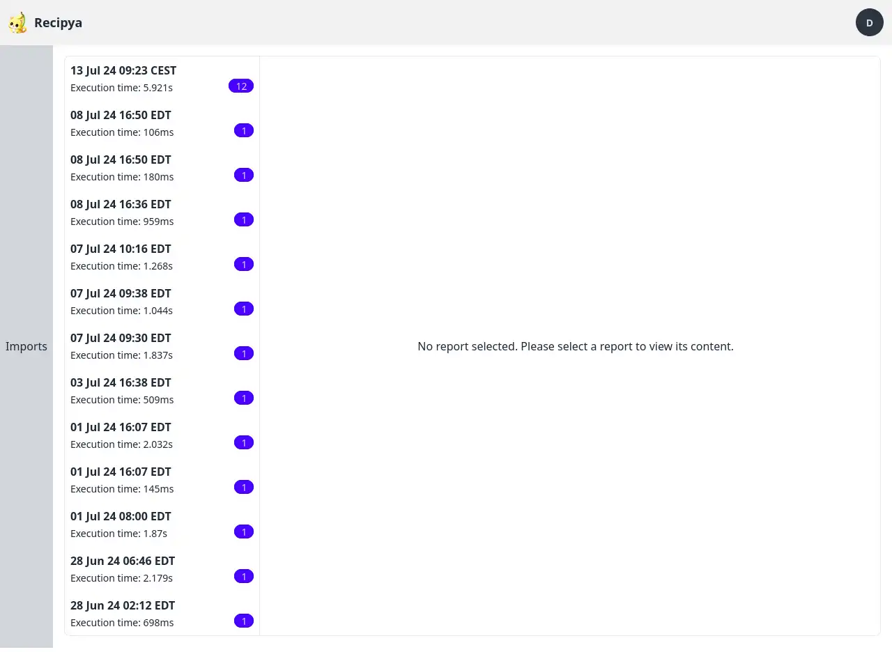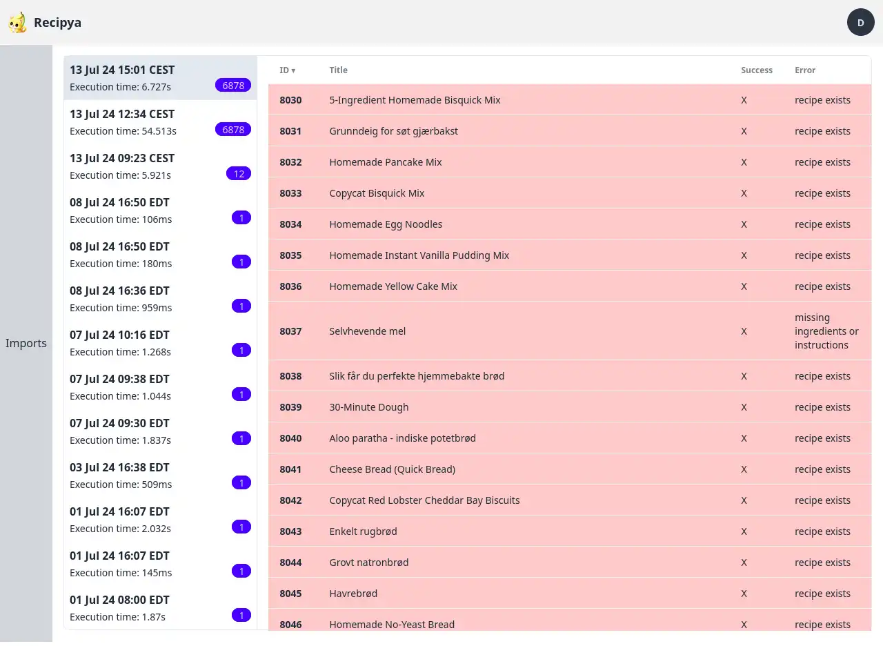 - Execution time : le temps nécessaire à l’importation des recettes.